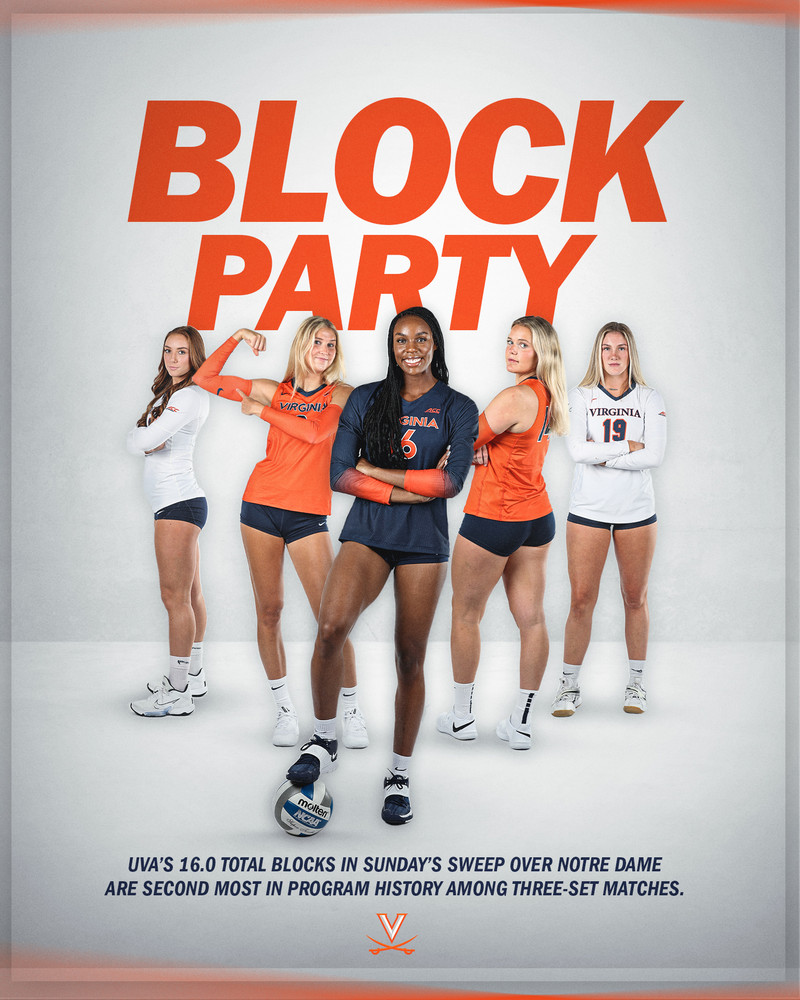 - Virginia’s 16.0 total blocks are good for second all-time in program history among three-set matches. The all-time record and last time UVA had at least 16.0 blocks in a single three-set match was on Sept. 30, 2006 against Maryland, when the Cavaliers posted 19.0 total blocks.