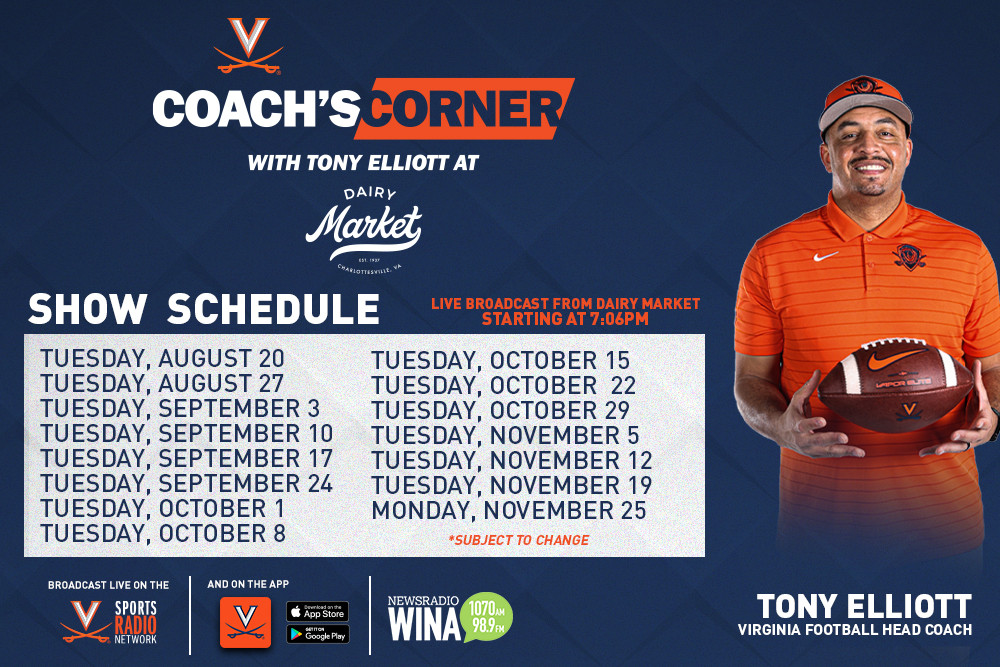 CHARLOTTESVILLE, Va. – Another season of Coach’s Corner with Tony Elliott kicks off on Aug. 20 (Tuesday) and will take place at a new location this year: the Dairy Market, Charlottesville’s Premier Food Hall (946 Grady Ave). The weekly radio show is set to air from 7-8 p.m., and is hosted by John Freeman, the “Voice of the Cavaliers.”