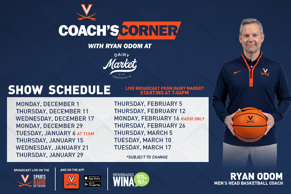 CHARLOTTESVILLE, Va. – Coach’s Corner with Ryan Odom returns Wednesday (Dec. 17) at the Dairy Market, Charlottesville’s Premier Food Hall (946 Grady Ave). The weekly radio show is set to air from 7-8 p.m., and is hosted by John Freeman, the “Voice of the Cavaliers.”